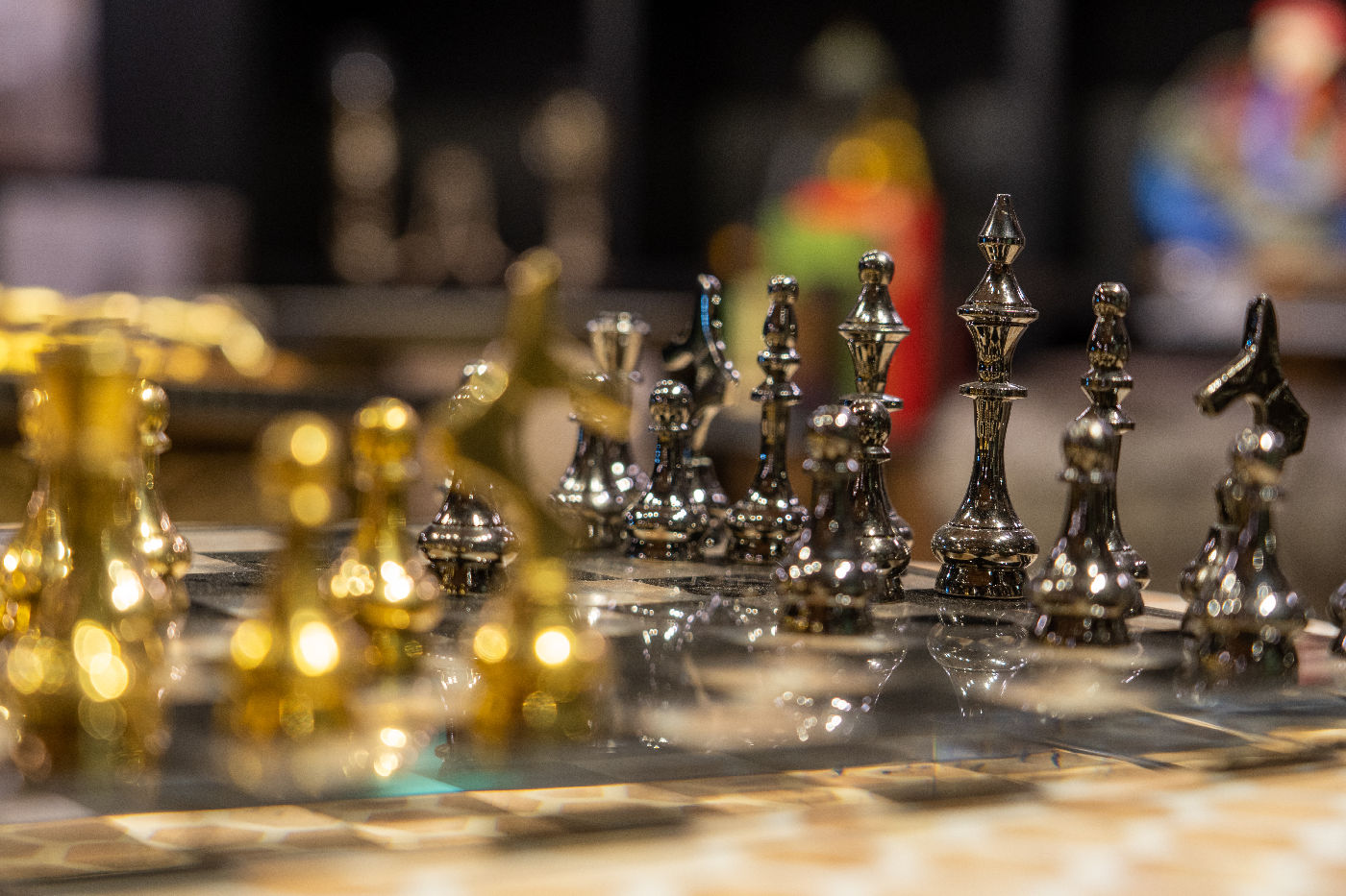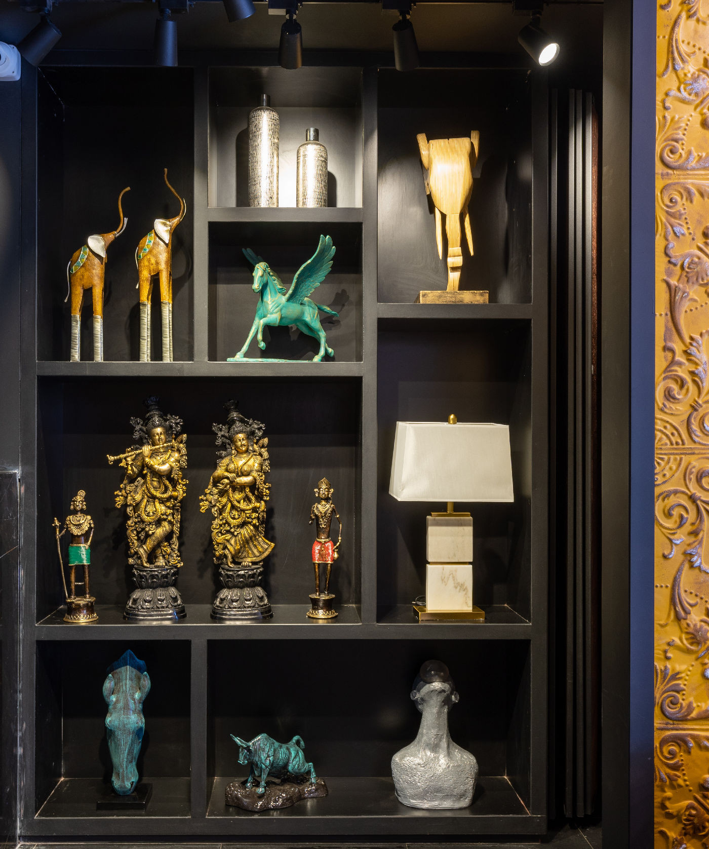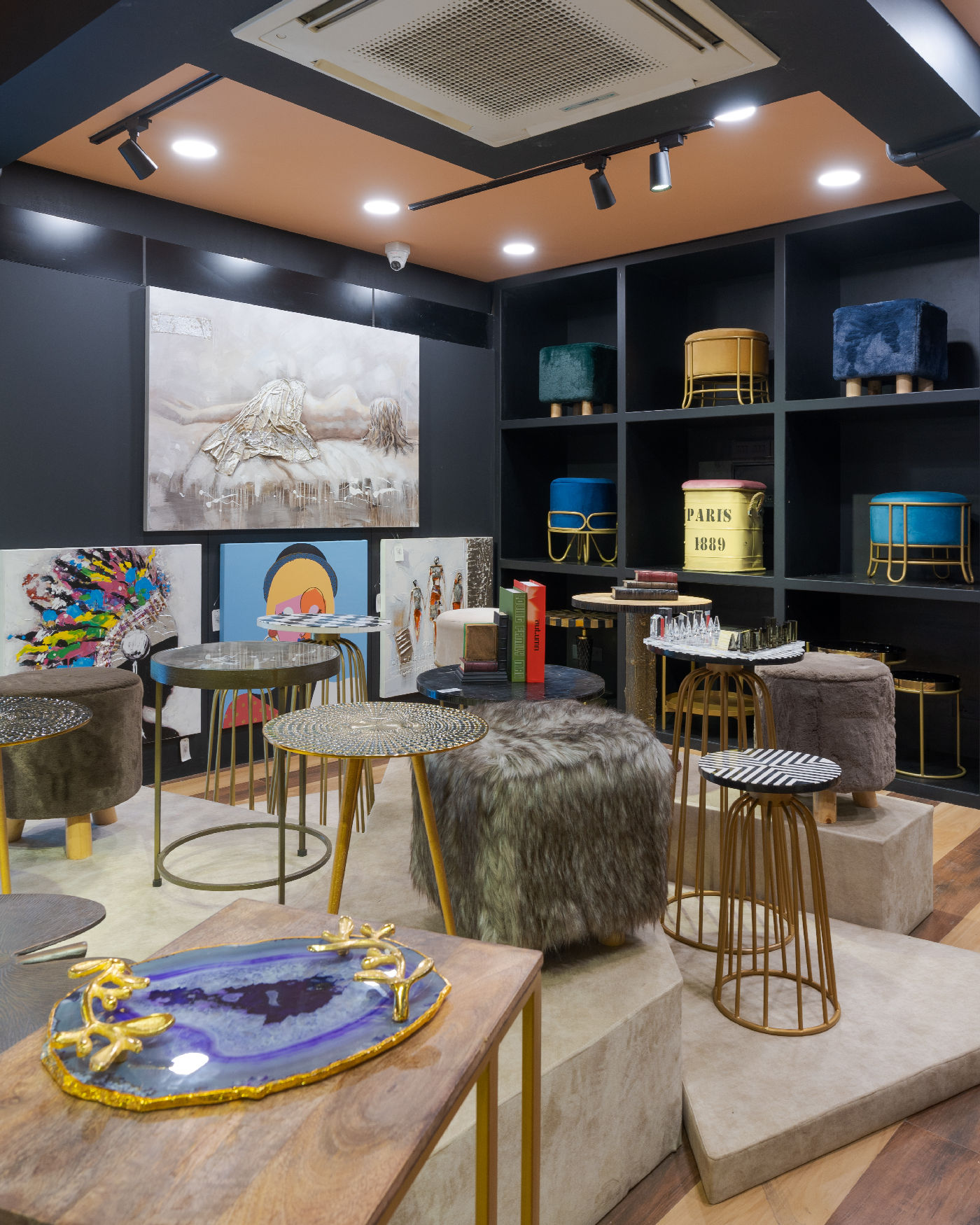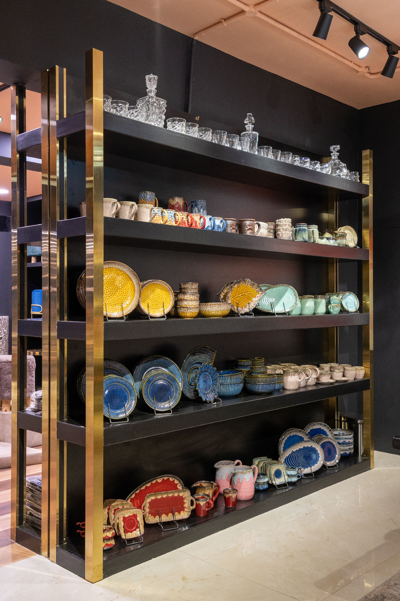 Custom gold and black racks, designed to showcase décor with elegance and impact