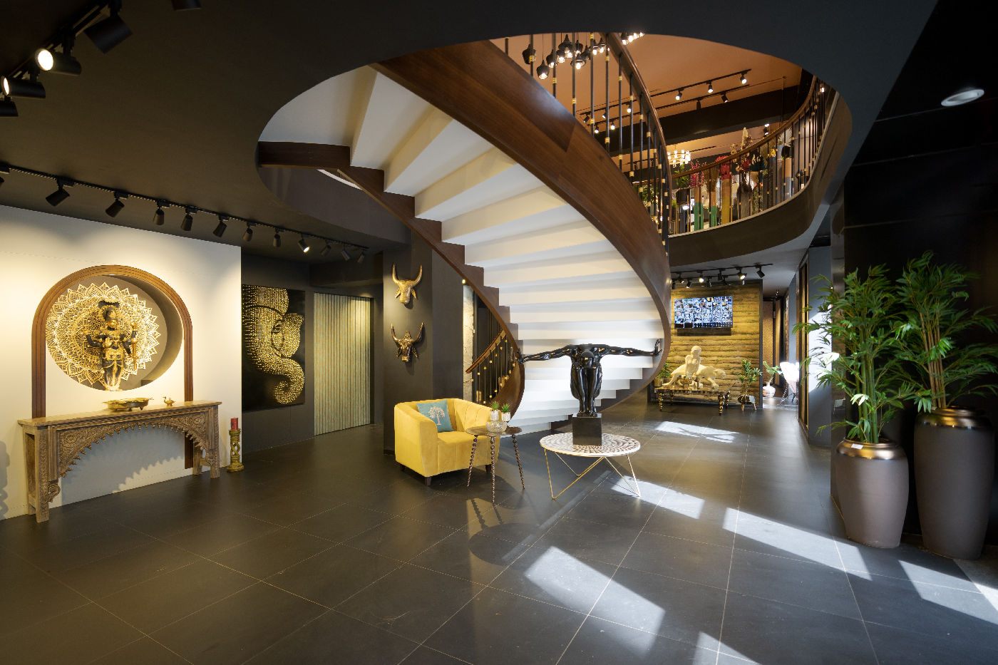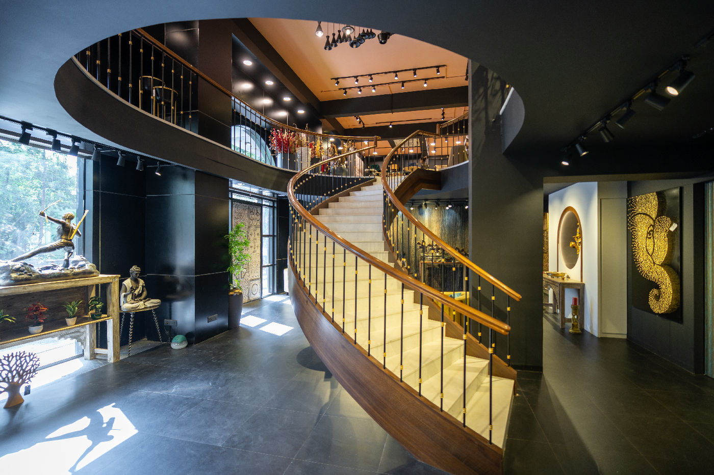 At its core, the showroom features a grand, sculptural staircase, set within a dramatic double-height circular volume. The half-curved staircase, anchored by sleek white flooring and bold black handrails, becomes both a structural centrepiece and a visual journey connecting both floors.
